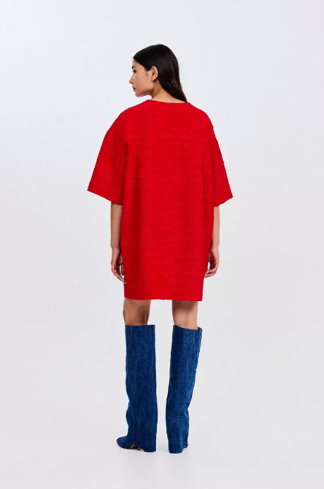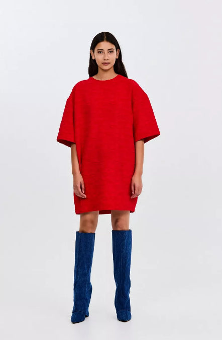 From work hours to dinner dates: deze paarsrode, korte jurk voor dames is jouw partner in crime. Dit kleedje heeft korte, laag ingezette mouwen, een ronde hals en een abstracte textuur. Maak je look deze herfst en winter compleet met boots.