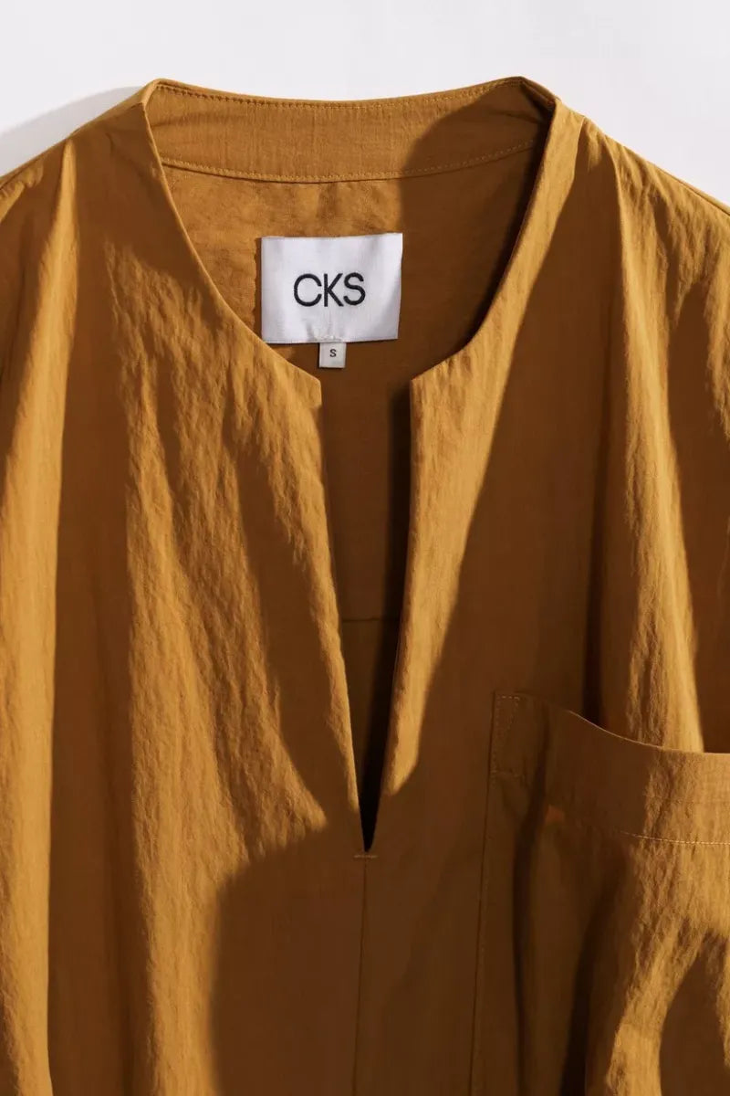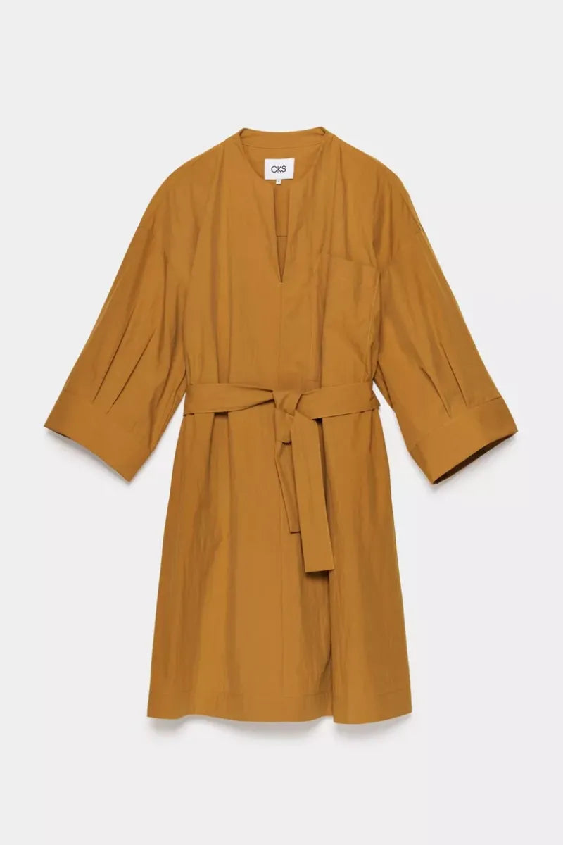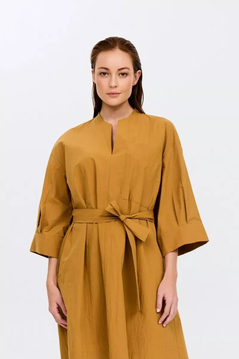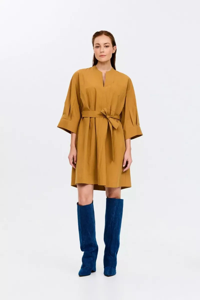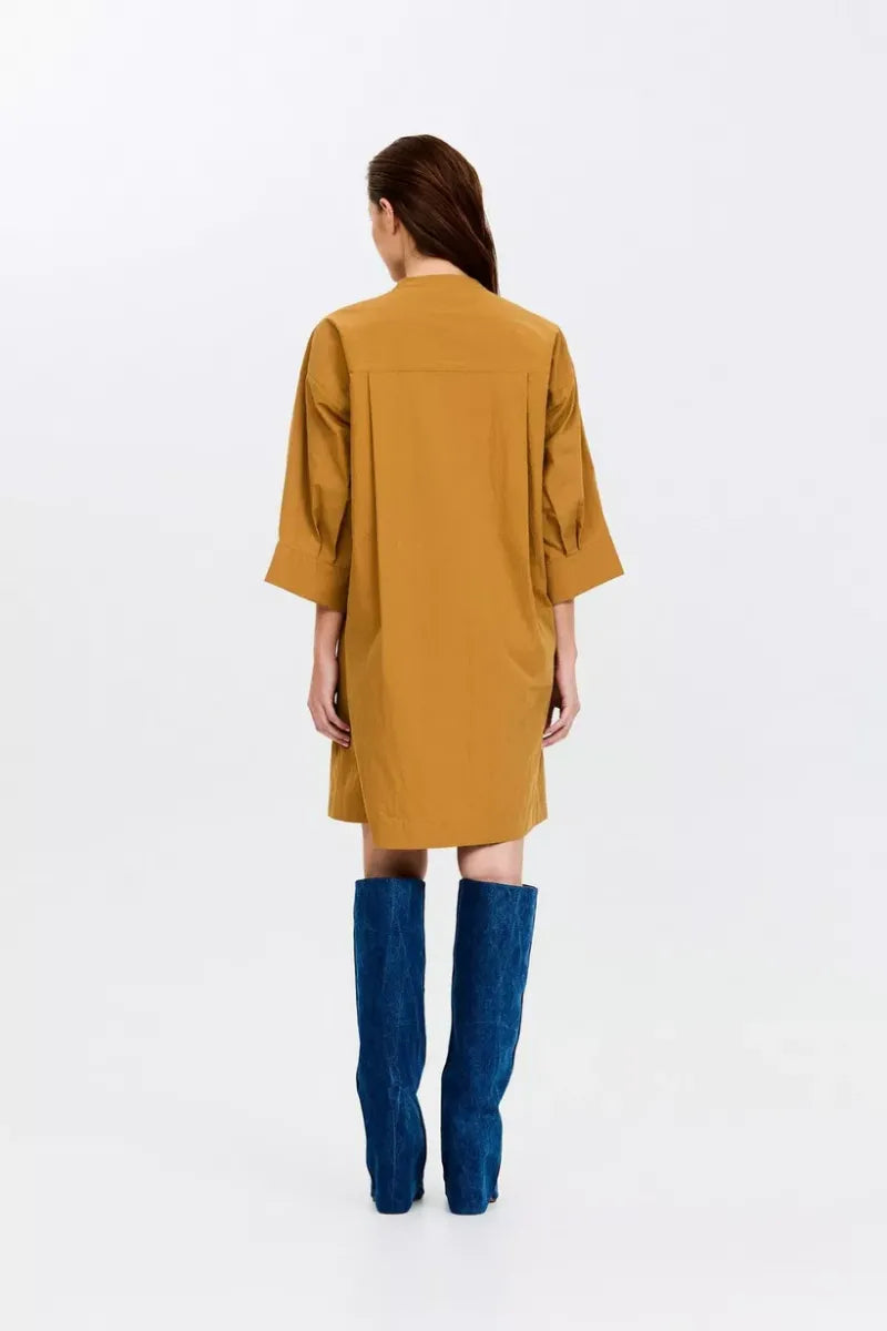 Okerkleurige, korte damesjurk ontworpen met halflange, afgeronde mouwen, een uitgesneden hals en een borstzak. De soepelvallende, katoenen stof zorgt voor een speelse look. Maak je look compleet met laarzen en je bent klaar voor een dag op kantoor en een etentje achteraf.