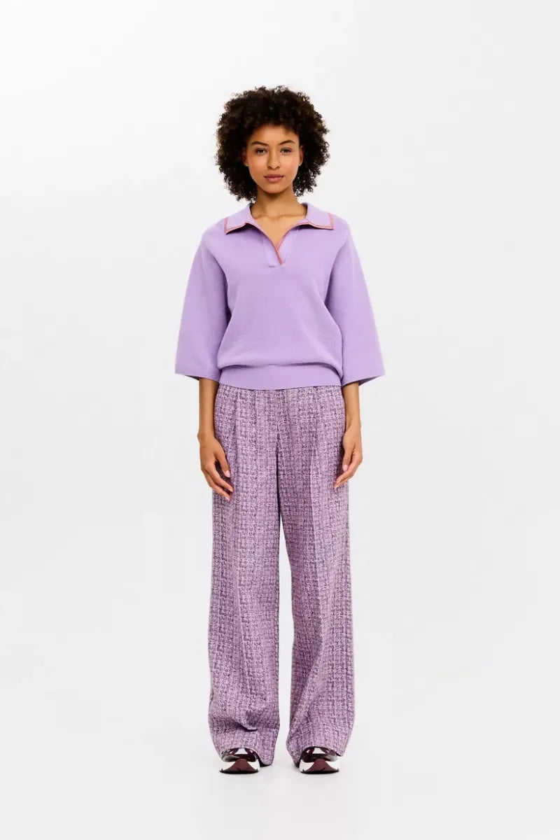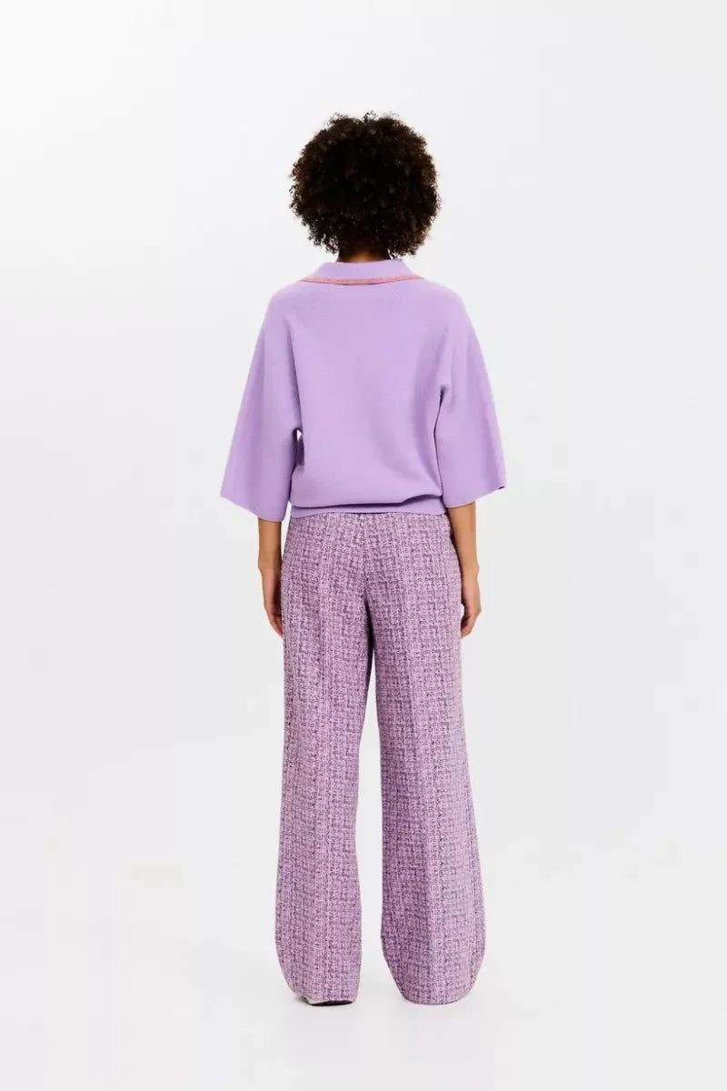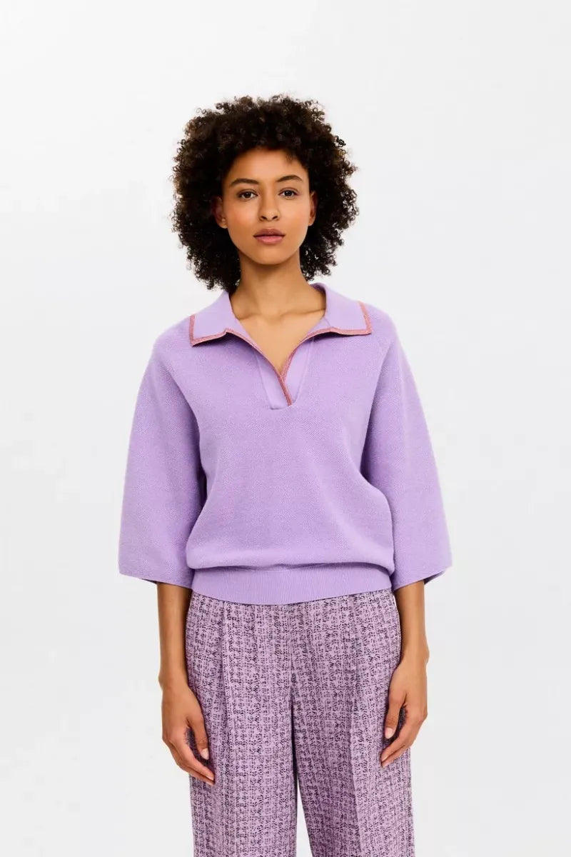 Deze lichtpaarse, gebreide polotrui voor dames heeft wijde, korte mouwen en een uitgesneden polo-kraag met een glitterboord.