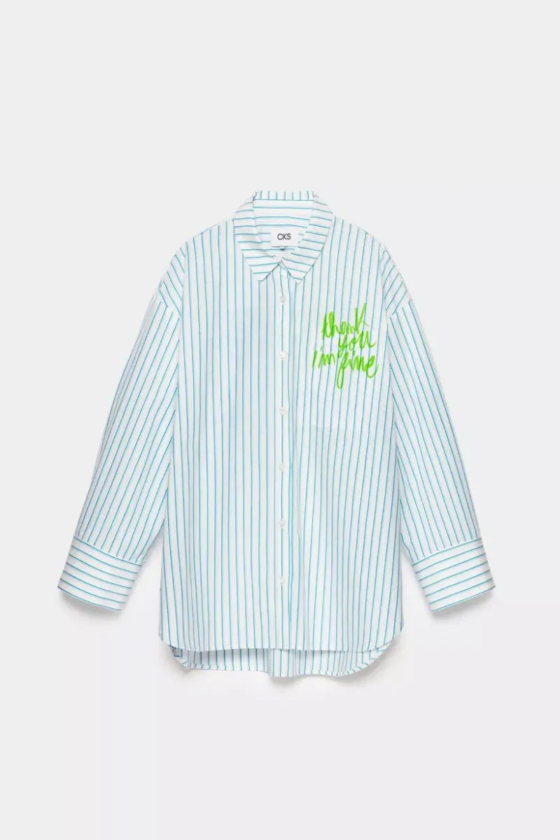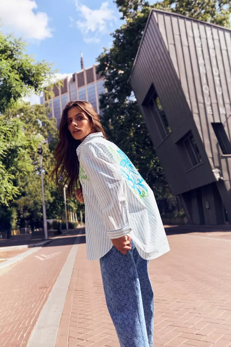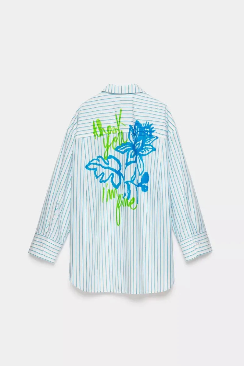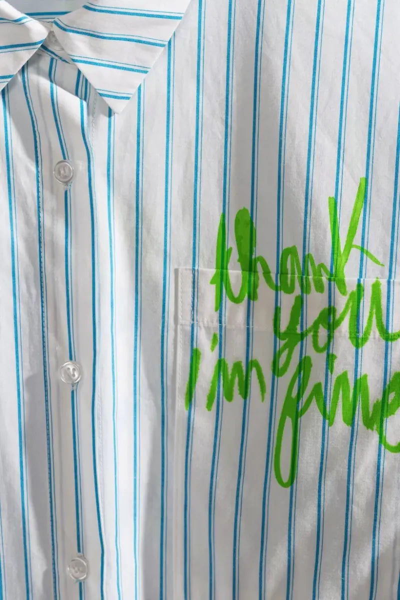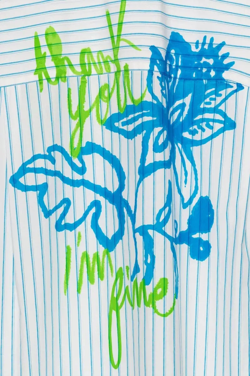 Krijg een instant crush op dit statement item door de combinatie van een blauwe streepjesprint met een handgeschreven print op het borstzakje en een opvallende tekst met bloem op de rug.