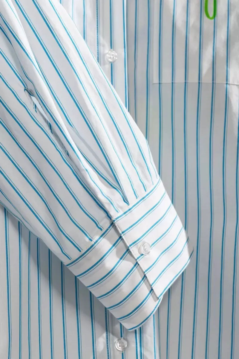 Het klassieke, gestreepte hemd voor dames wordt naar een hoger niveau getilt met deze witte, langere hemdblouse.