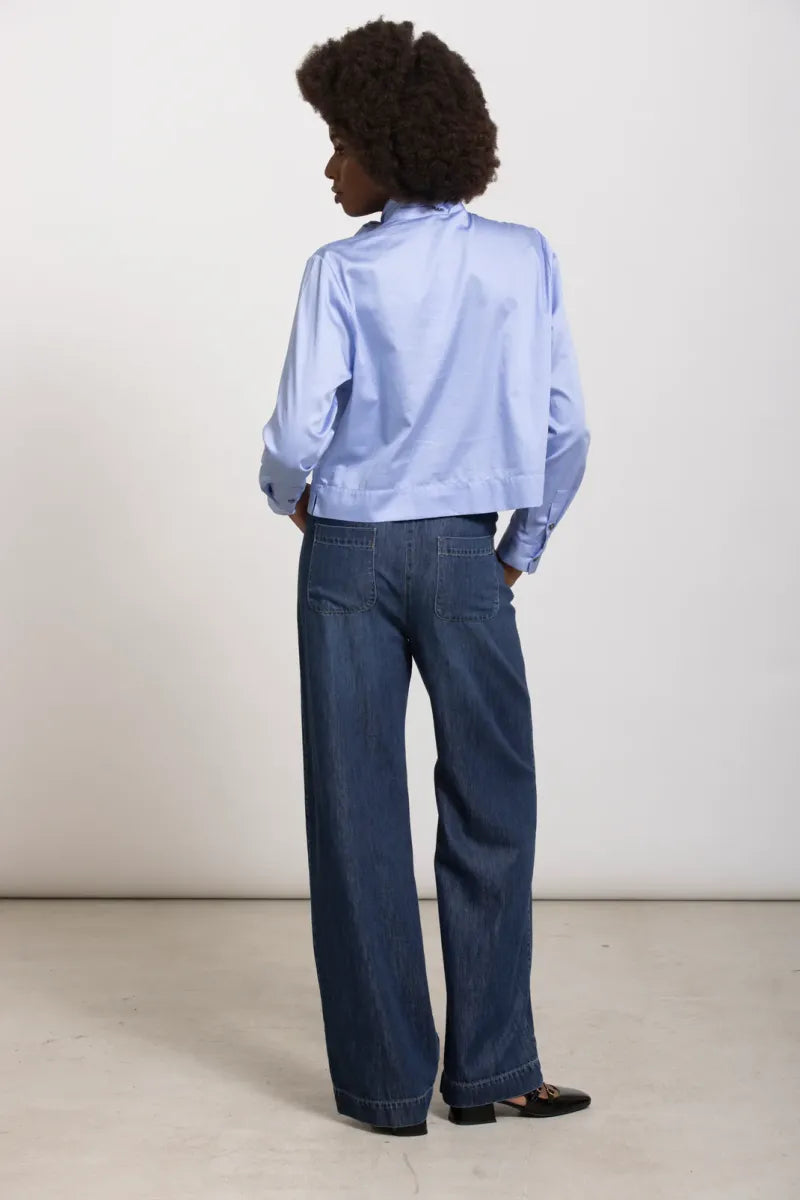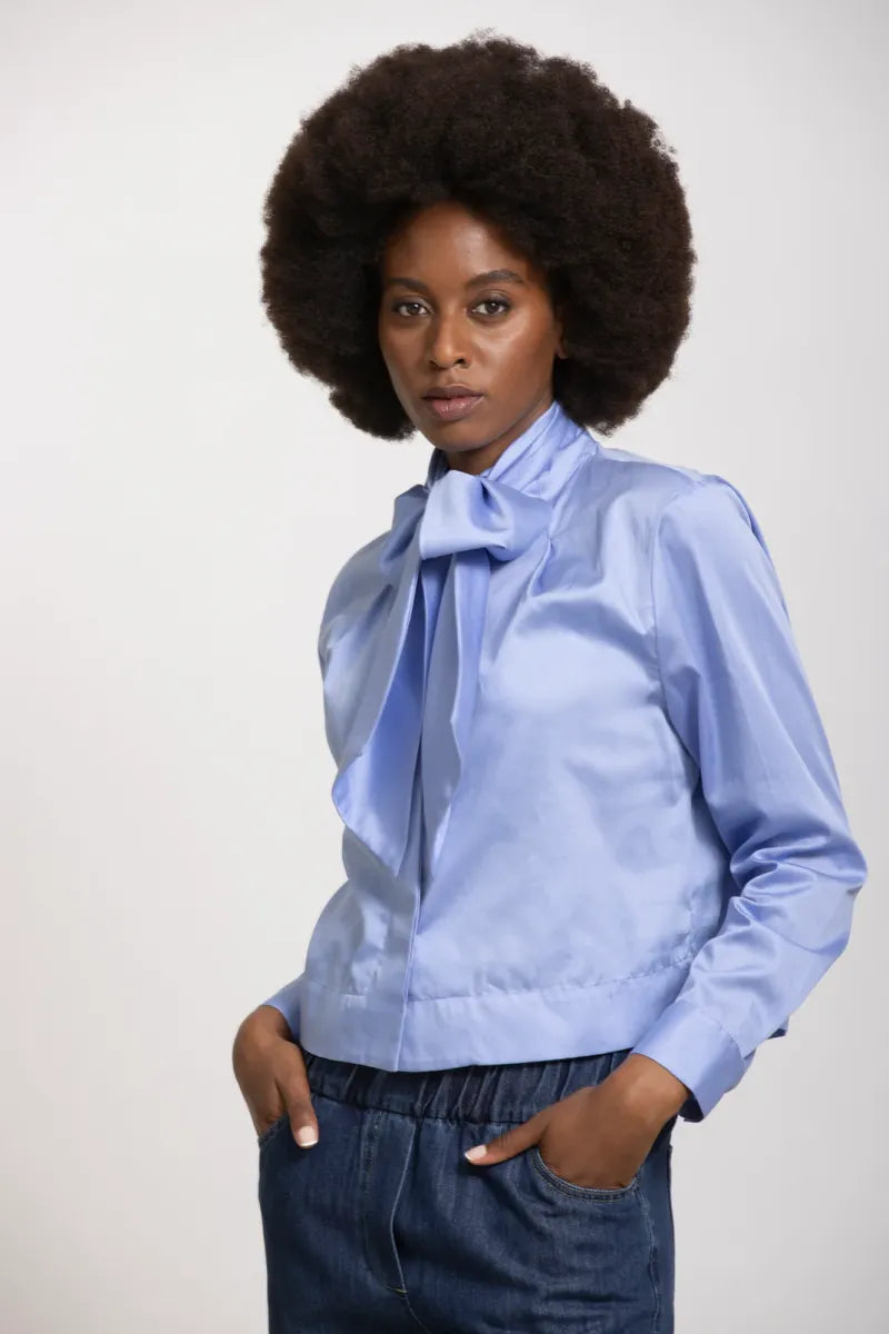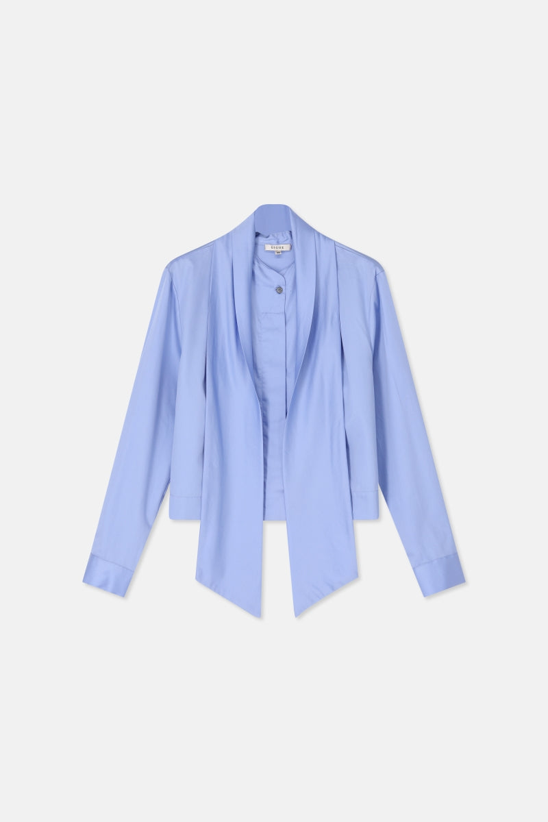 Super toffe bloes in lichtblauw crispy katoen met afneembare sjaalkraag om creatief te knopen of los te dragen.