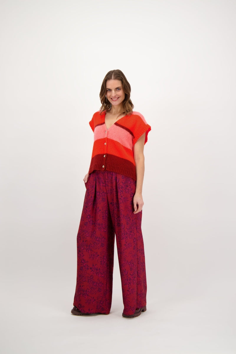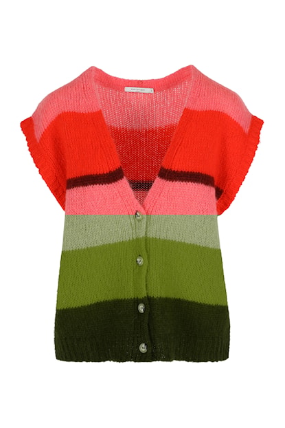Deze mouwloze debardeur met oranje - bordeaux strepen is dé ideale layering piece. De knoopsluiting vooraan geeft het item een extra leuke twist en maakt het gemakkelijk combineerbaar over een T-shirt, blouse of jurk. Sporty-chic met een knipoog, en perfect om kleur toe te voegen aan je outfit.