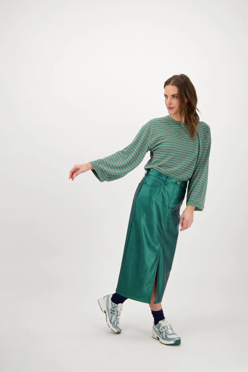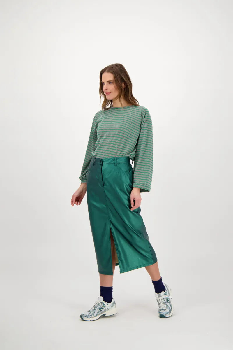 Deze kokerrok in glanzende groene viscose trekt meteen de aandacht.