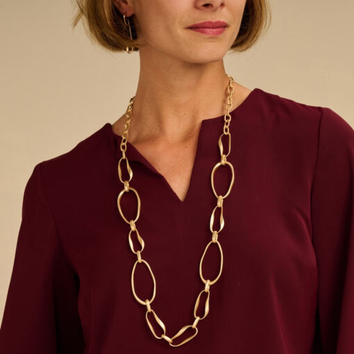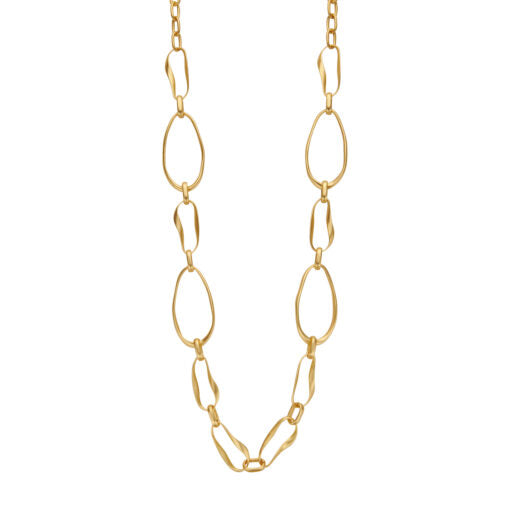 Lange halsketting in mat goudkleurig metaal met opvallende golvende schakels die een moderne, vrouwelijke uitstraling geven.