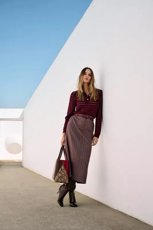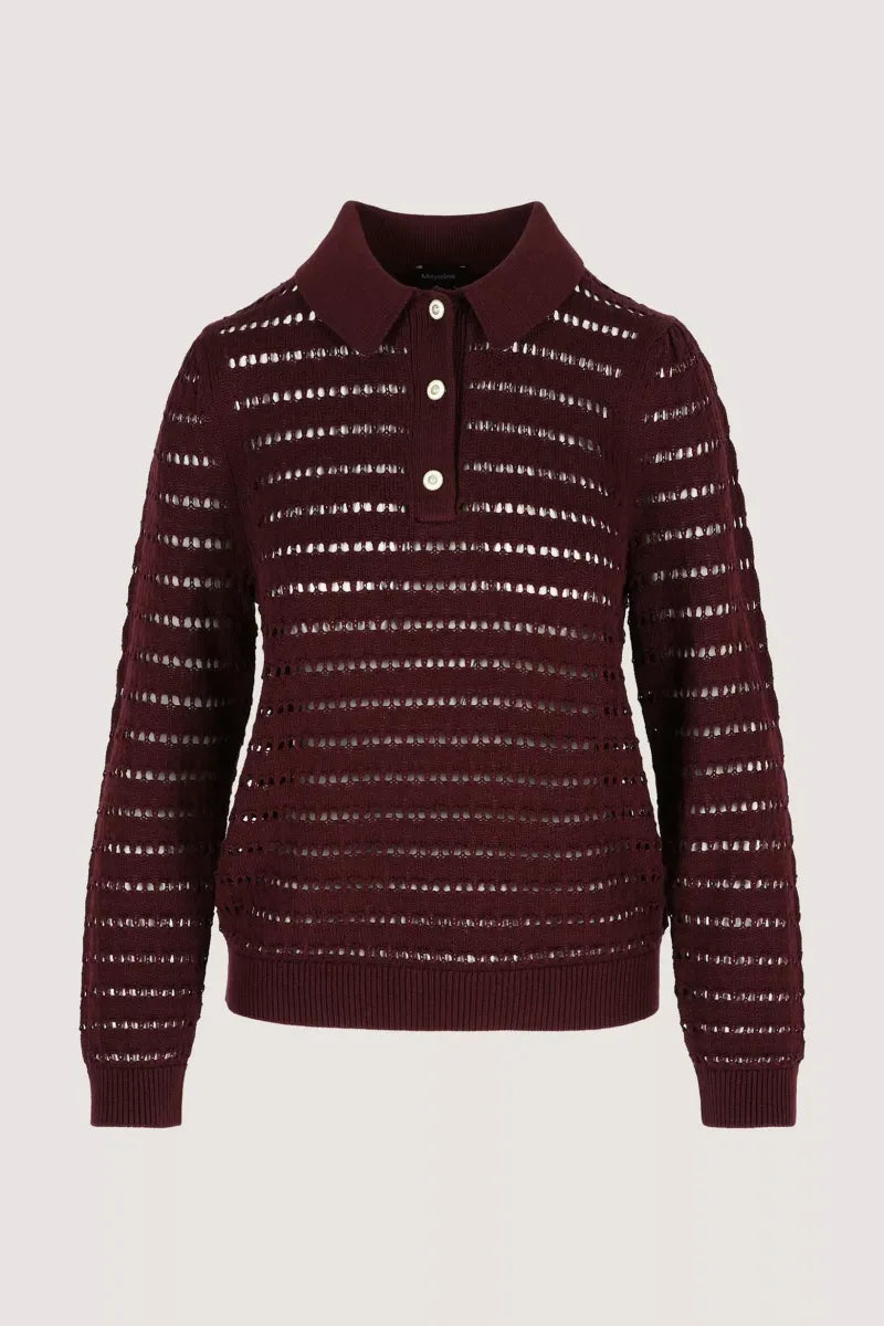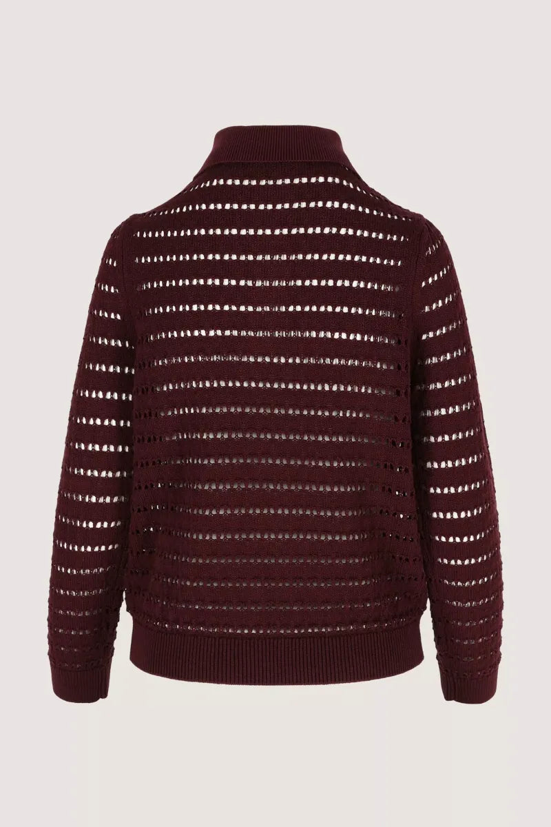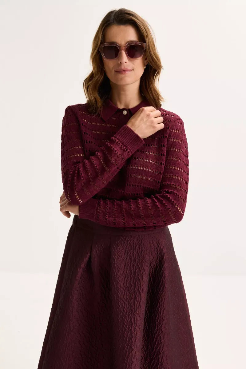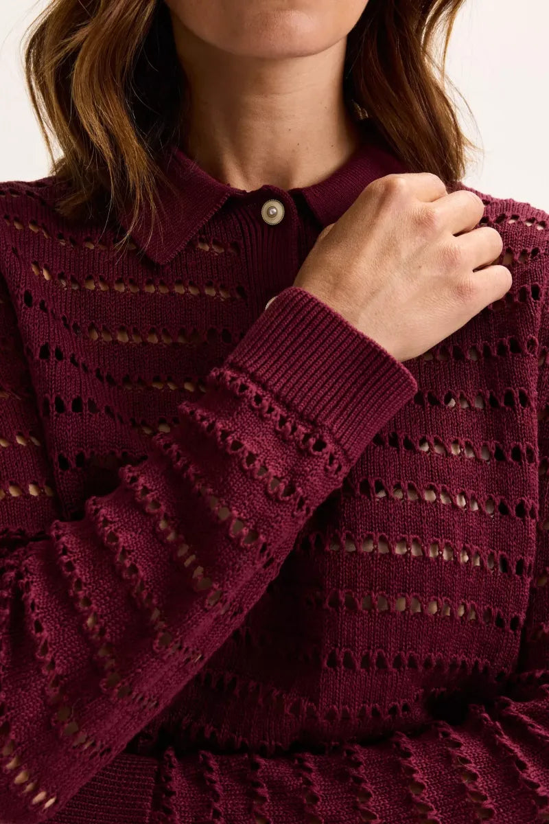 Deze ajourtrui in een zachte mix van katoen en lyocell is het perfecte voorbeeld van casual met klasse. De polokraag en fantasieknopen geven een preppy uitstraling, terwijl het luchtige ajourbreisel zorgt voor een vrouwelijke, verfijnde look. Ideaal voor een urban outfit die net dat tikkeltje meer mag hebben. Liever iets minder doorkijk? Draag er dan jersey top Jinto onder in dezelfde kleur. Tijdloos, stijlvol en verrassend veelzijdig.