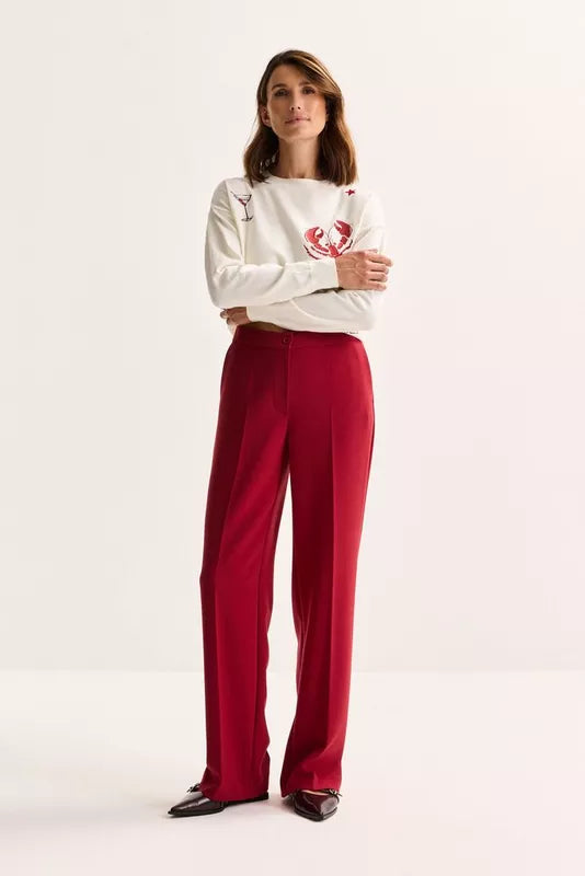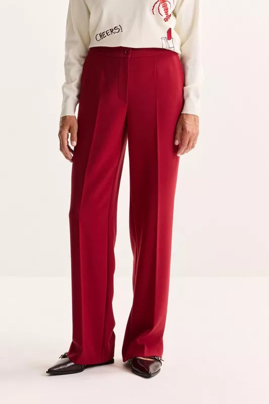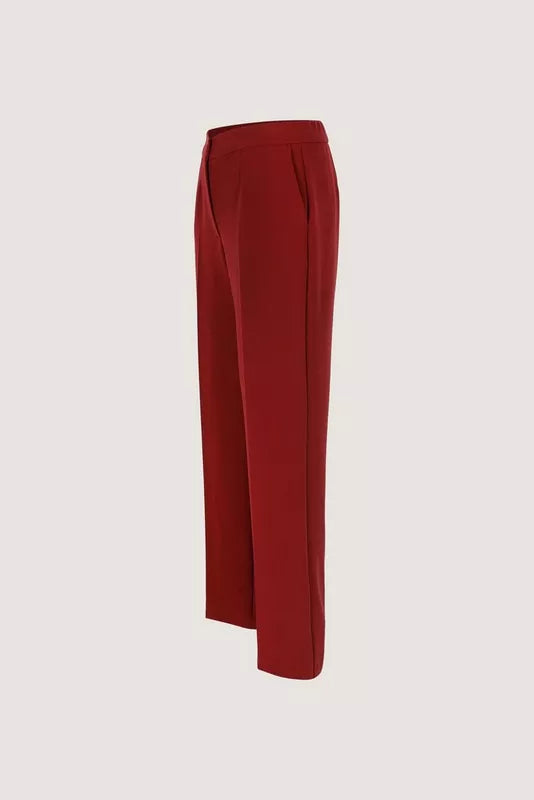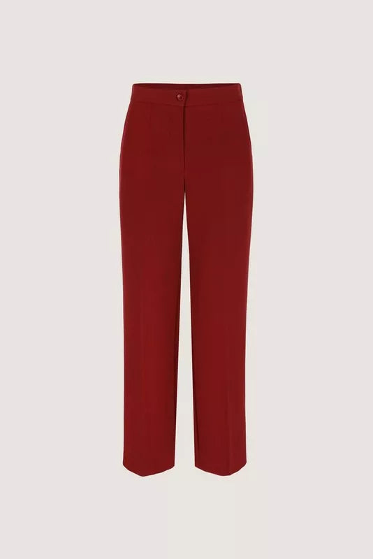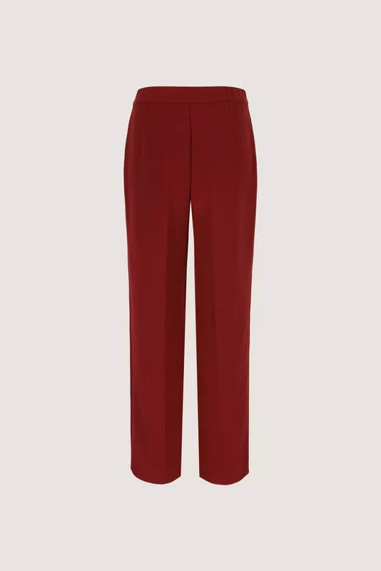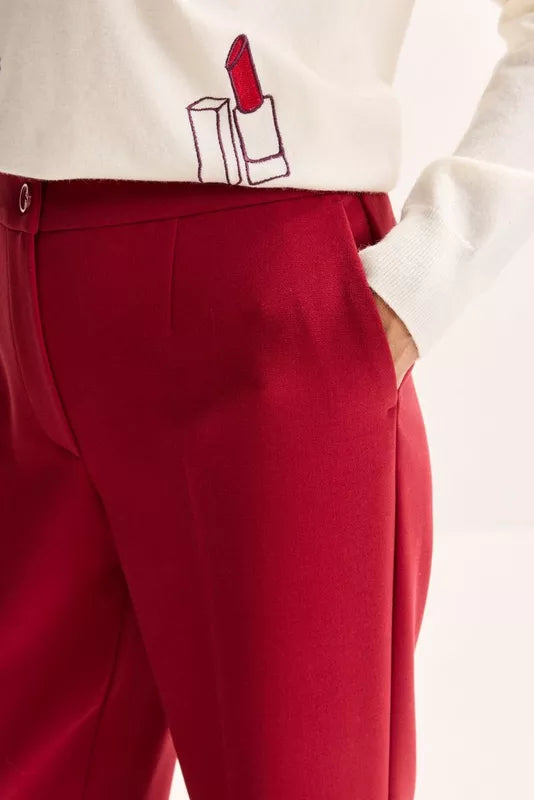 Deze elegante kostuumbroek combineert stijl met gemak. De elastische tailleband met rugelastiek sluit mooi aan zonder te knellen, terwijl de rits vooraan zorgt voor een nette afwerking. Dankzij de riemlussen kun je een ceintuur van 4 cm toevoegen voor een perfecte fit.