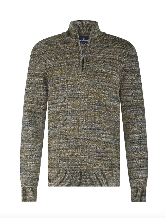 Deze grofgebreide trui met halve rits, rubberen badge op de mouw en regular fit heeft een uitgesproken gemêleerd dessin dat direct opvalt. De mix van acryl en wol voelt stevig maar zacht aan en biedt aangename warmte. Space dye-garen zorgt voor een bijzonder kleurverloop waardoor elke trui uniek is, met speelse kleuraccenten en diepte in het breisel.