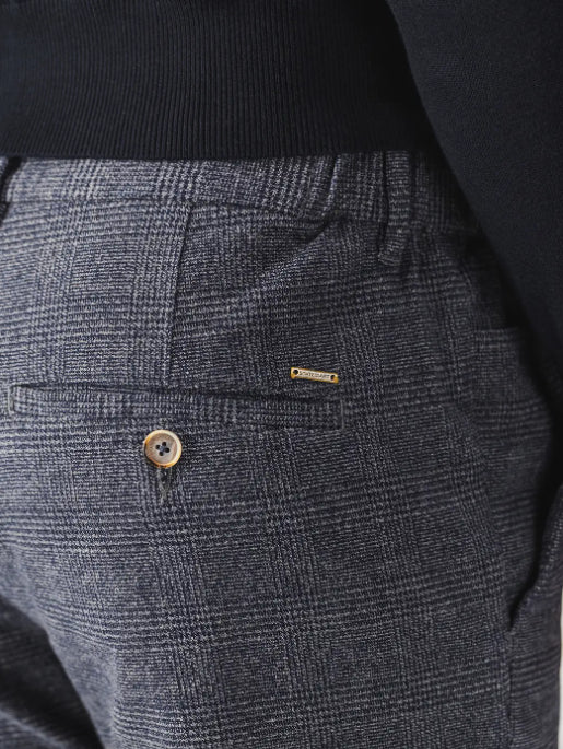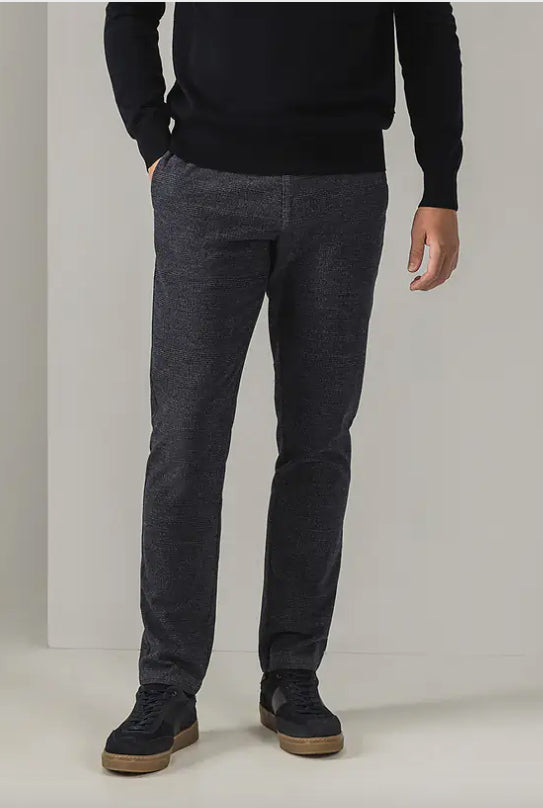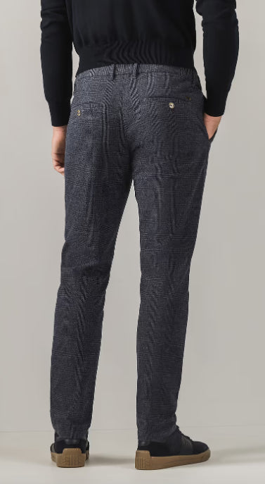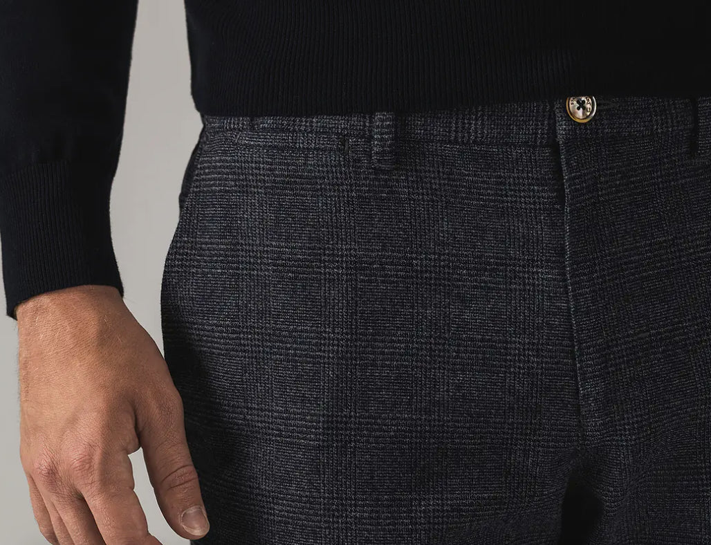 De broek heeft een klassieke uitstraling dankzij de band met riemlussen, knoop- en ritssluiting, terwijl de combinatie van steekzakken voor en paspelzakken achter zorgt voor een verzorgde afwerking. De elastische stof biedt bewegingsvrijheid zonder in te leveren op stijl.