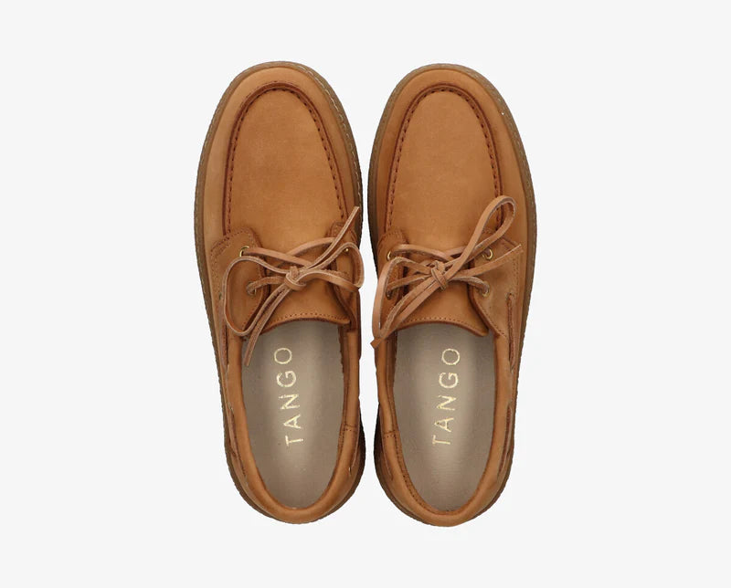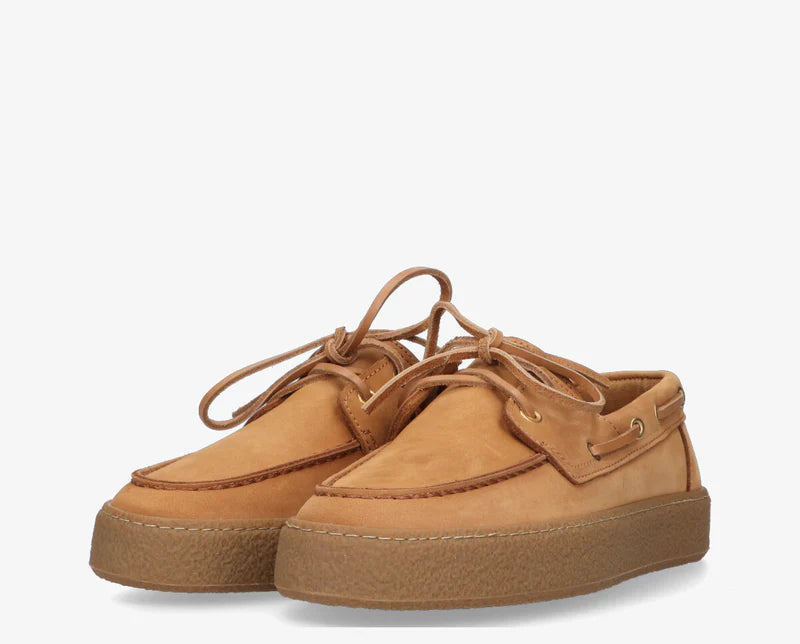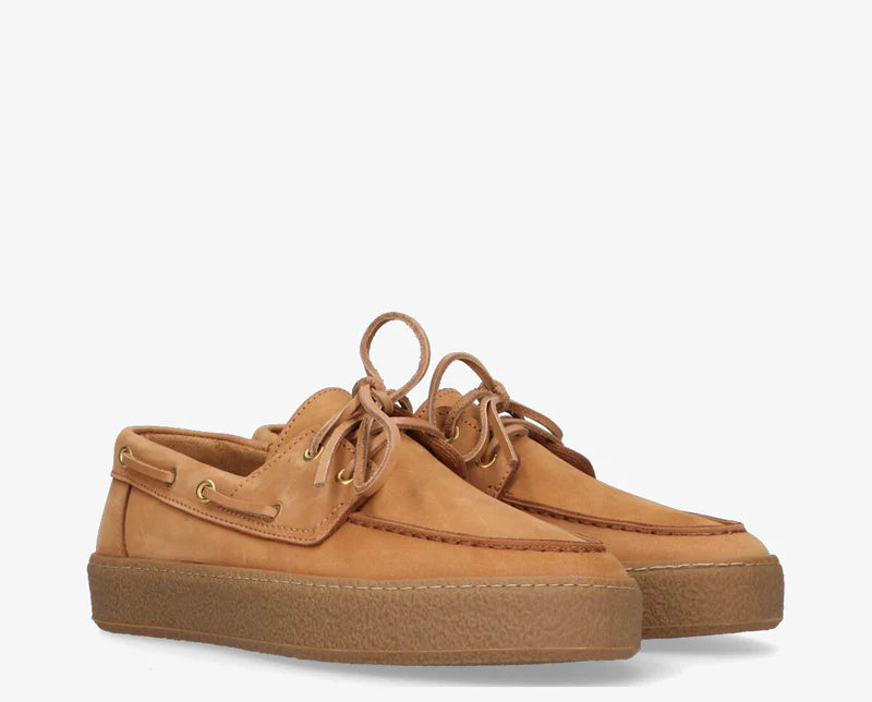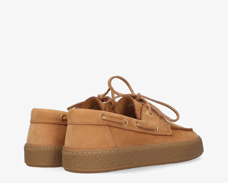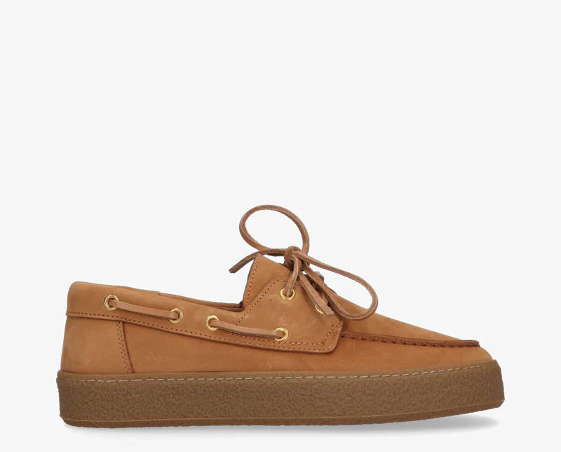 De Fia is een eigentijdse interpretatie van de klassieke bootschoen. Vervaardigd uit hoogwaardig donkerbruin leer en voorzien van een stevige rubberen zool voor extra comfort en grip. De leren veters en metalen oogjes geven deze schoen een authentieke, maritieme uitstraling.